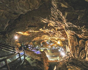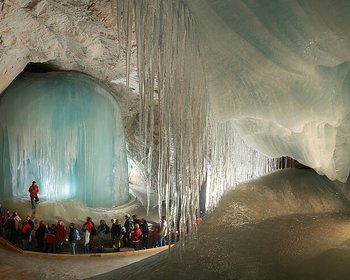 Glasklare Eissäulen und viele herausgewitterte Fossilien führen durch romantisch anmutende Gänge. Der Westausgang bietet einen grandiosen Blick auf die Loferer Steinberge.