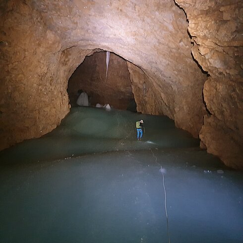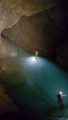 Riesenhöhle in 2100 m Seehöhe mit 2 Eisteilen, Ausdauer und alpine Erfahrung erforderlich.